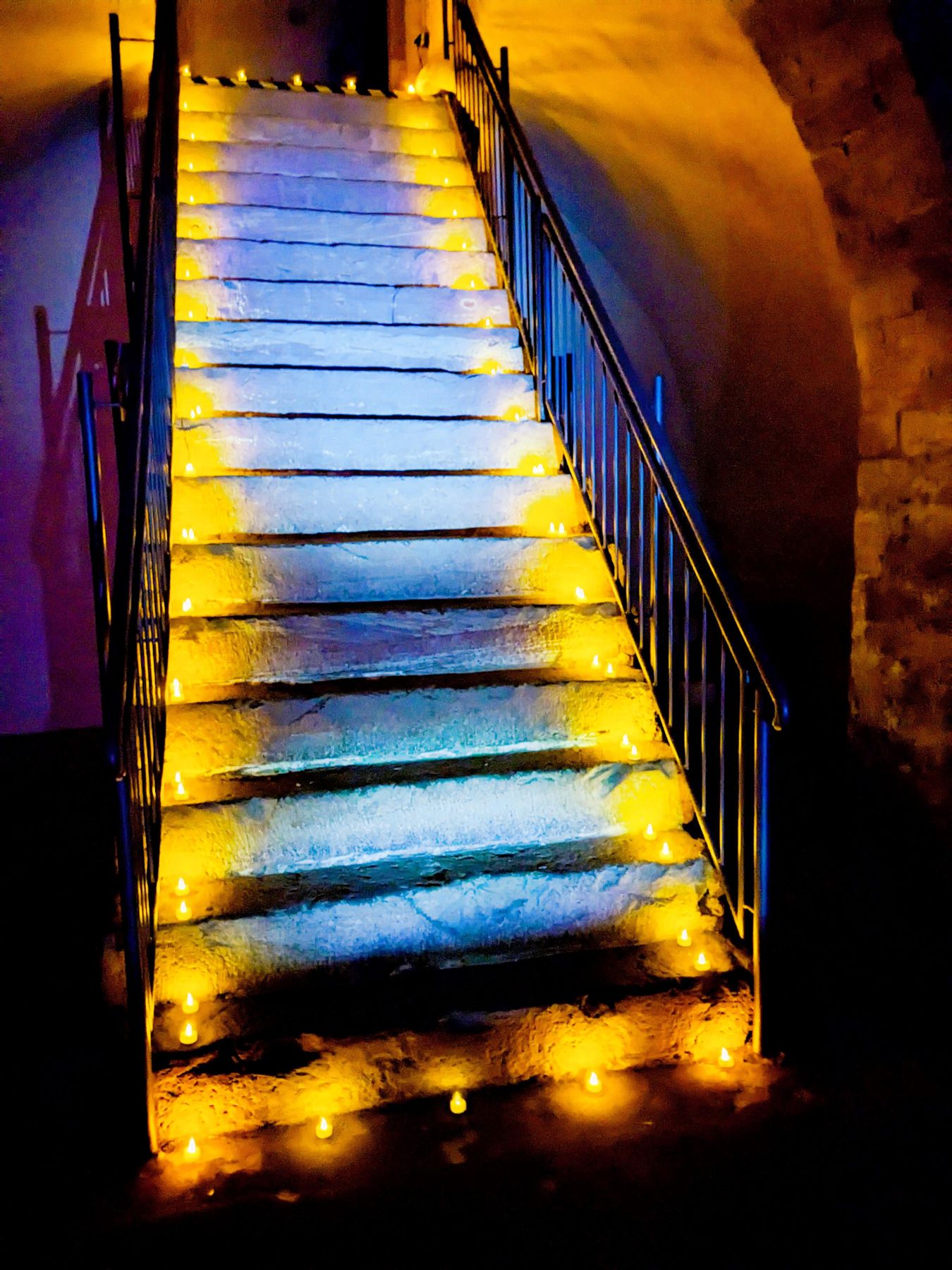 Hunderte LED-Lichter verzaubern die alten Gänge und Gewölbe des Fort Josef und des Wasserschlösschens mit einer besonderen Stimmung. Sie machen die architektonische Schönheit der von kurfürstlichen Baumeistern geschaffenen unterirdischen Anlagen sichtbar.